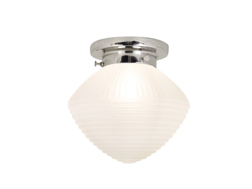 Kvalitní materiály: konstrukce z niklovaného kovu doplněná ručně foukaným frostovaným sklem – estetické i praktické řešení.