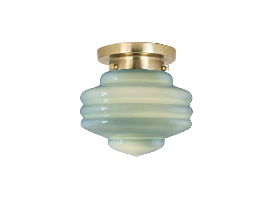 Elegantní stropní lampa s mosazným povrchem a kapkovitým opálovým sklem v zeleném odstínu. Design inspirovaný přelomem 19. a 20. století vytváří příjemnou atmosféru v různých interiérech.