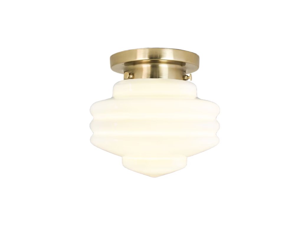 Elegantní stropní lampa s mosazným povrchem a kapkovitým opálovým sklem v bílém odstínu. Design inspirovaný přelomem 19. a 20. století vytváří příjemnou atmosféru v různých interiérech.
