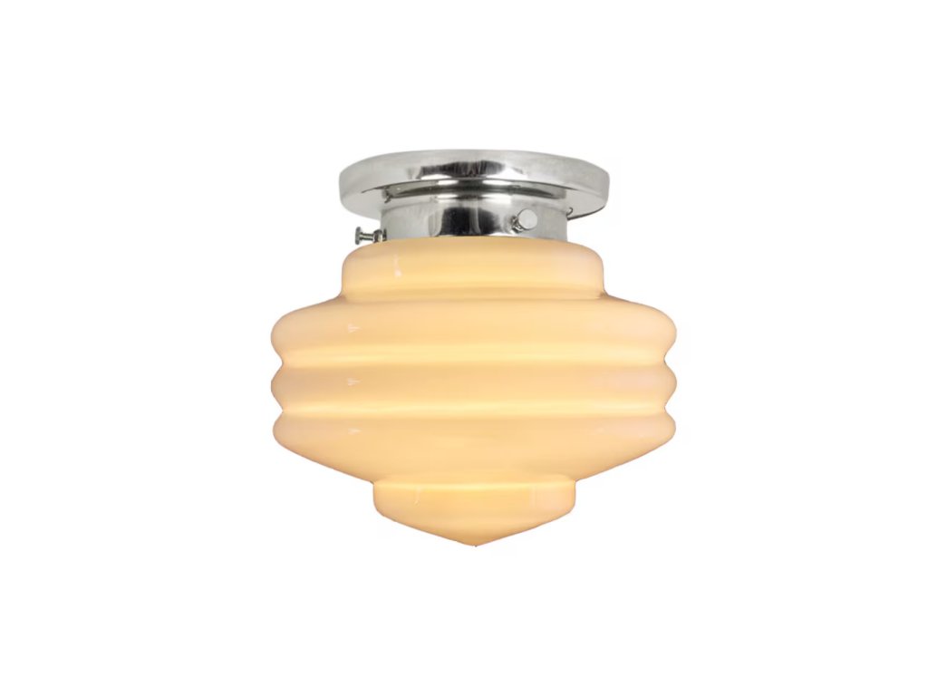 Elegantní stropní lampa s poniklovaným povrchem a kapkovitým opálovým sklem v béžovém odstínu. Design inspirovaný přelomem 19. a 20. století vytváří příjemnou atmosféru v různých interiérech.