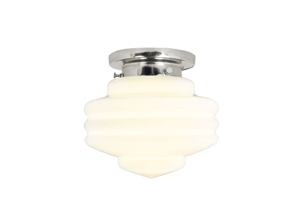 Elegantní stropní lampa s poniklovanným povrchem a kapkovitým opálovým sklem v bílém odstínu. Design inspirovaný přelomem 19. a 20. století vytváří příjemnou atmosféru v různých interiérech.