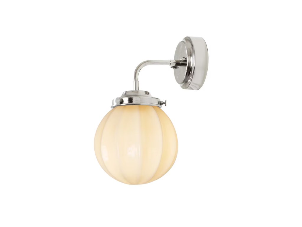 Elegantní nástěnná lampa s kovovou niklovou základnou a kouřově béžovým opálovým sklem. Designově inspirovaná koncem 19. století, vytváří příjemné, mírně rozptýlené světlo, vhodné pro koupelny a další menší prostory.