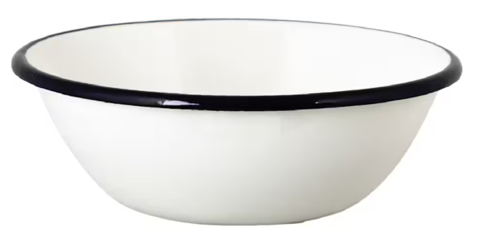 Tradiční bílý smalt s tenkým černým okrajem – nadčasový vzhled, který skvěle zapadne do rustikálních i industriálních interiérů