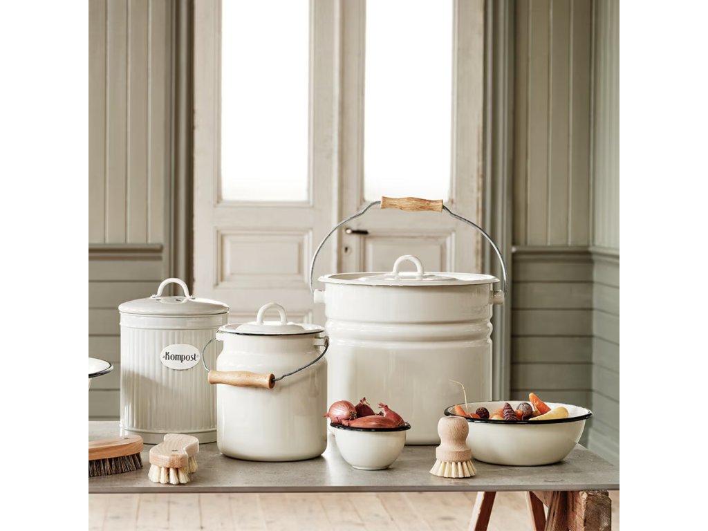 Tradiční bílý smalt s tenkým černým okrajem – nadčasový vzhled, který skvěle zapadne do rustikálních i industriálních interiérů