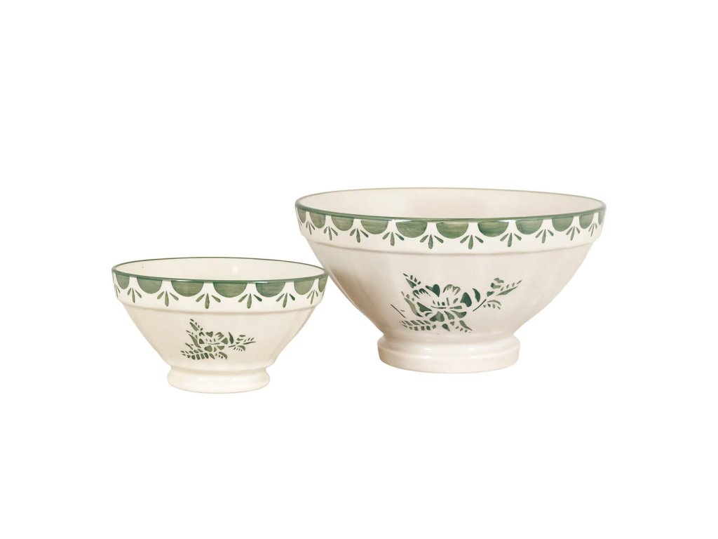 Středně velká miska z kameniny, zdobená ručně malovaným klasickým lemem a decentním zdobením po obvodu. Inspirovaná tradičním venkovským stylem, hodí se na servírování pokrmů či jako dekorace na jídelní stůl.