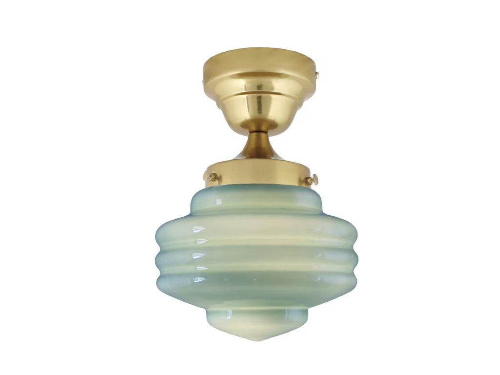 Elegantní lampa s kovovým stropním úchytem nebo závěsem a ručně foukaným opálovým sklem. Kulatý tvar skla vytváří měkké, rozptýlené světlo ideální pro různé domácí prostory – od koupelny až po obývák či předsíň