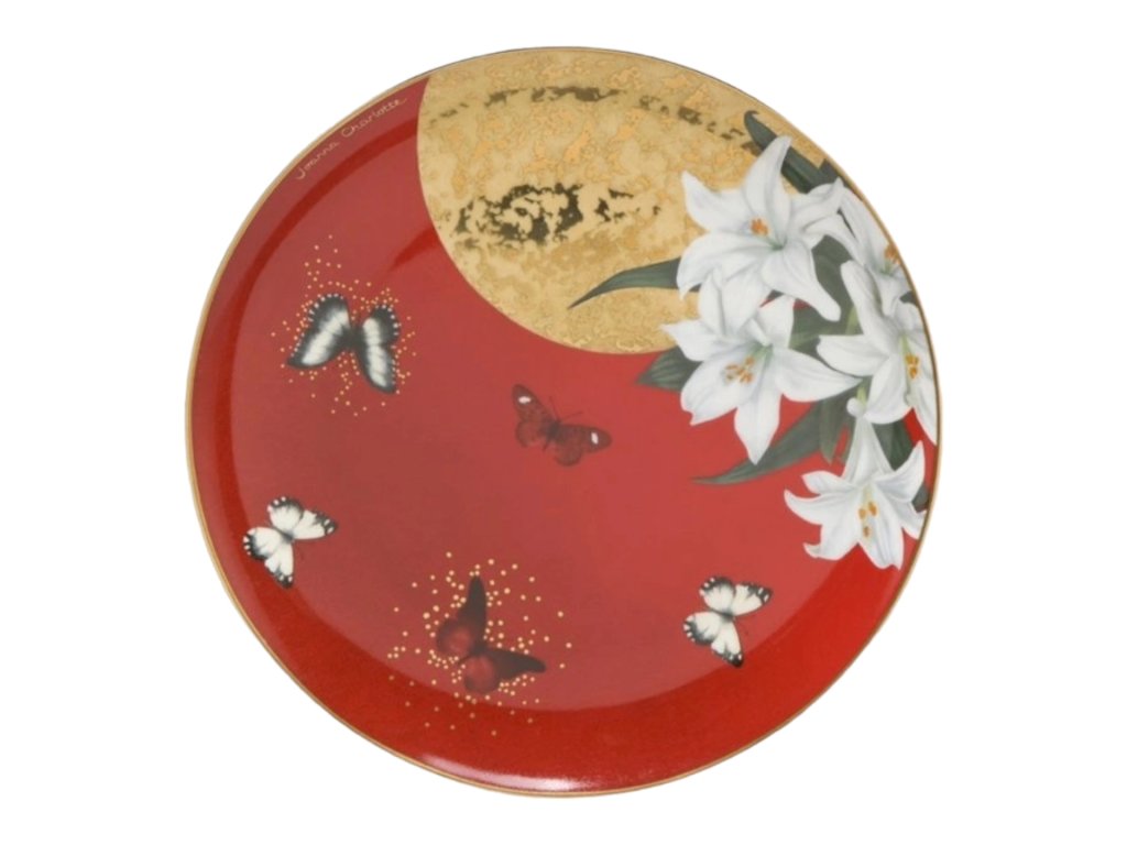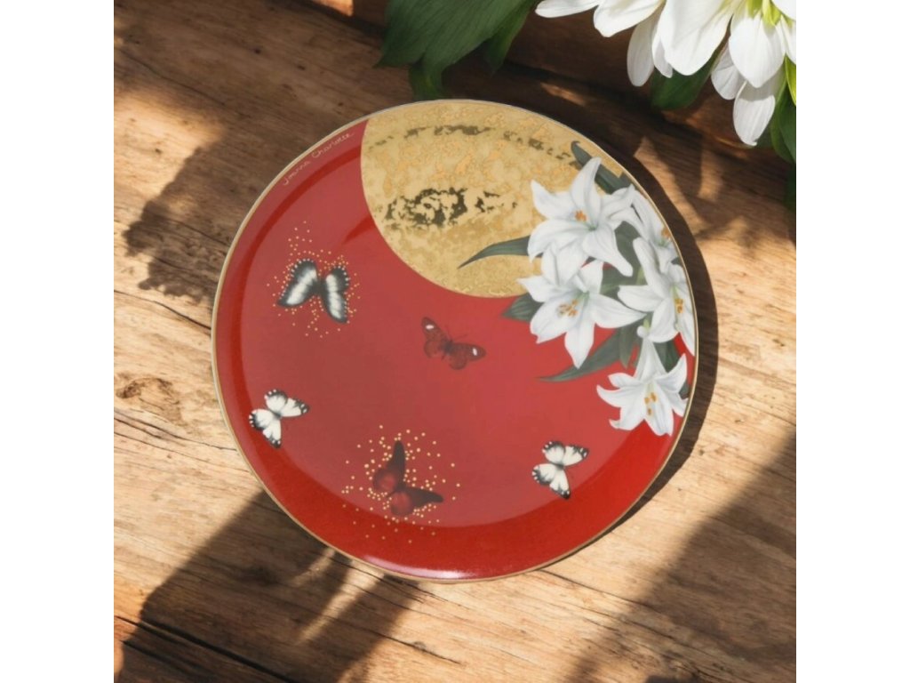 • Design: Červený dezertní talíř s motivem červených lilií, navržený Joannou Charlotte.