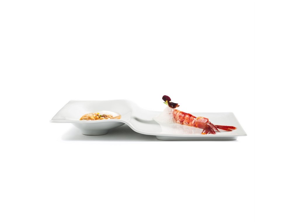Talíř ve tvaru schodiště. Může sloužit jako mělký talíř s oddělenou přílohou, nebo naopak jako talíř hluboký s pevnými přílohami.