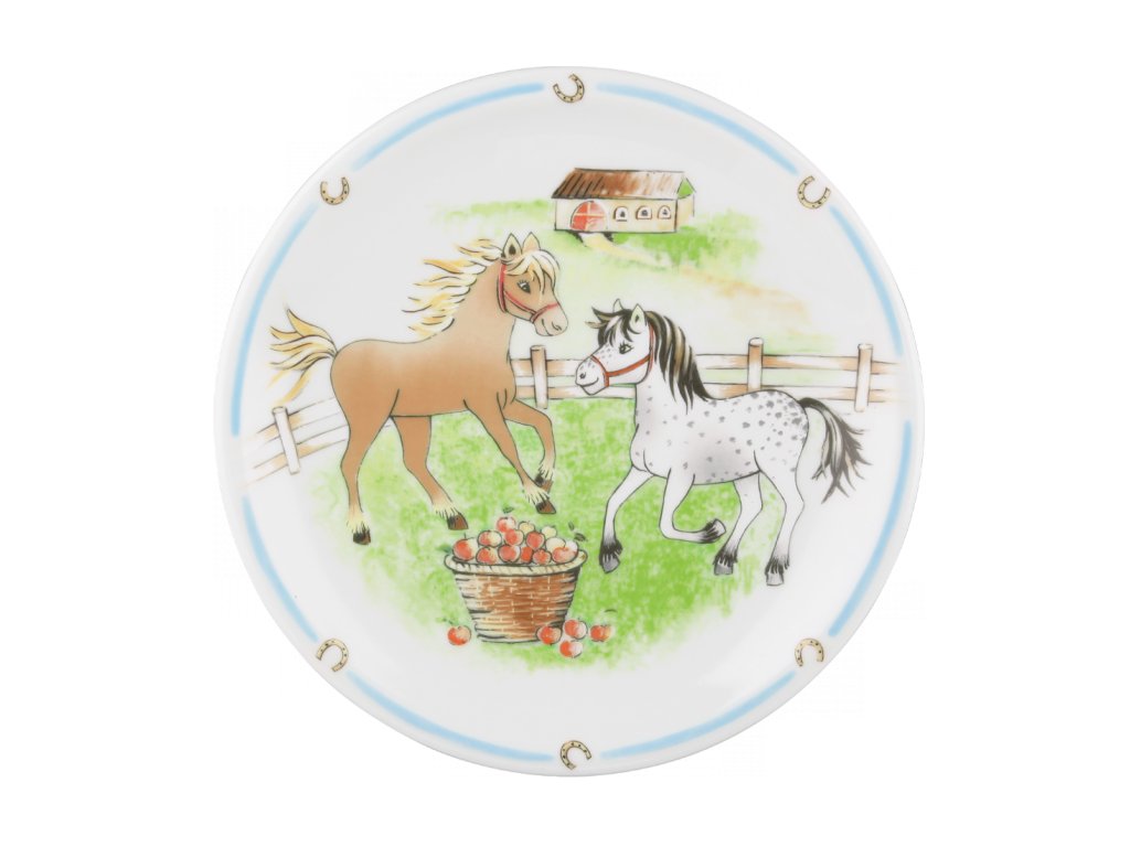 Dezertní talíř s hříbětem na pastvě a symbolem štěstí - podkovou.