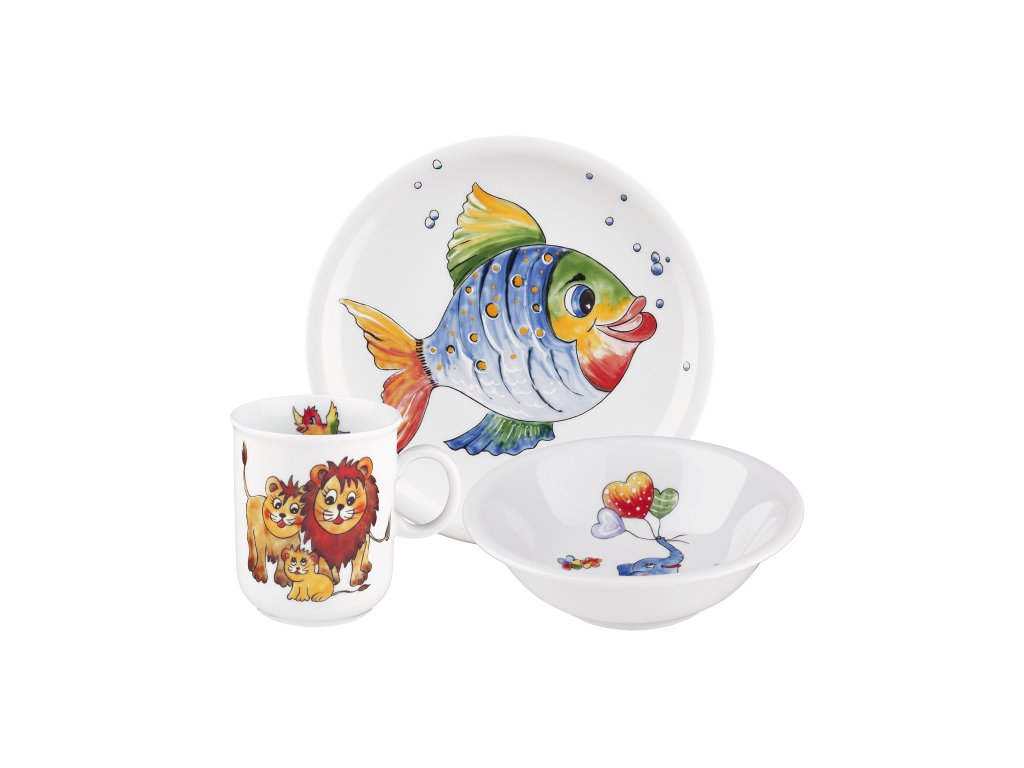 Sada dětského porcelánu s motivy pestrobarevných zvířátek, které vykouzlí úsměv na tváři nejen dětí.