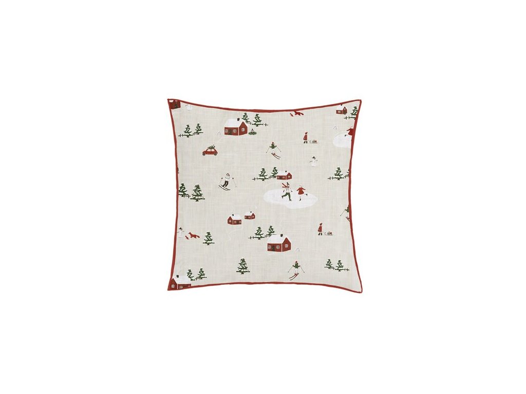 Přineste do svého domova kousek zimní pohody s tímto nádherně vyšívaným povlakem Vinterland. Světlý béžový podklad zdobí roztomilé motivy zasněžené krajiny – chaloupky, stromy, dětské sněhové radovánky –, díky kterým působí útulně i slavnostně a zároveň nadčasově.