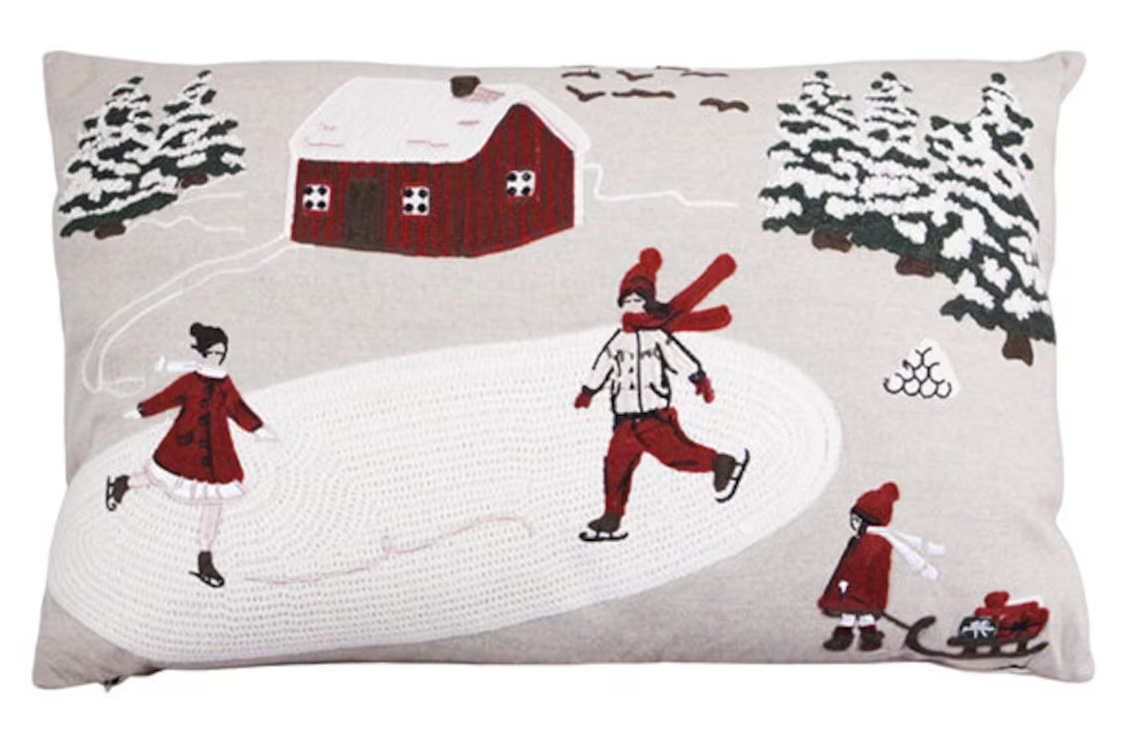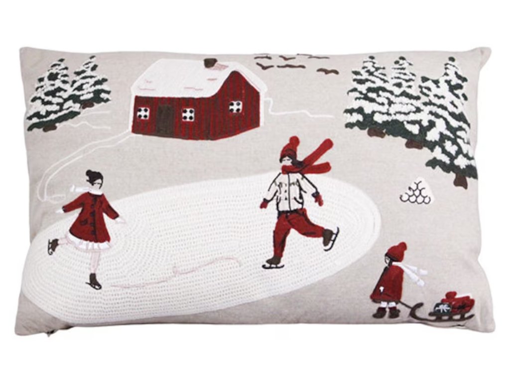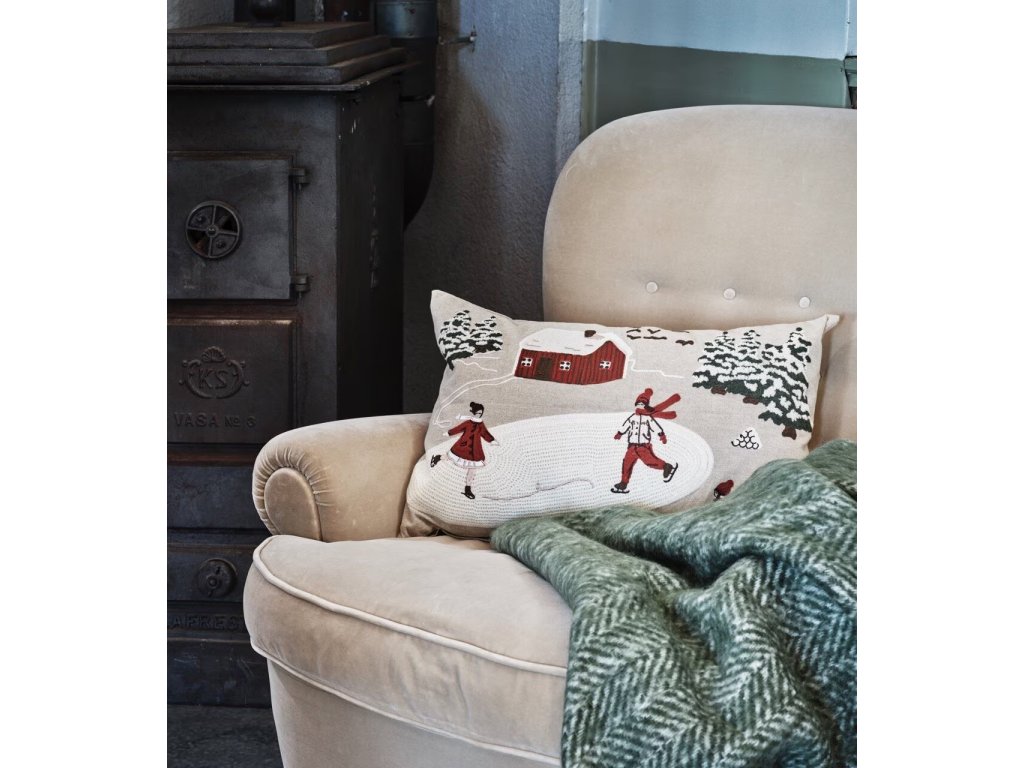 Zahalte svůj domov do hřejivé zimní atmosféry s krásně vyšívaným povlakem Vinterland. Tento jemný textilní doplněk je vyroben ze 100 % organické bavlny a zdoben precizní výšivkou s motivy zasněžené severské krajiny – chaloupkami, stromečky a zimními radovánkami.