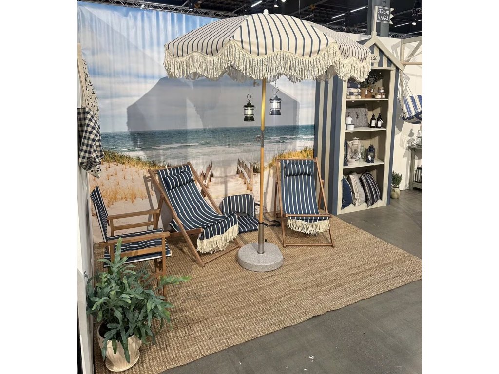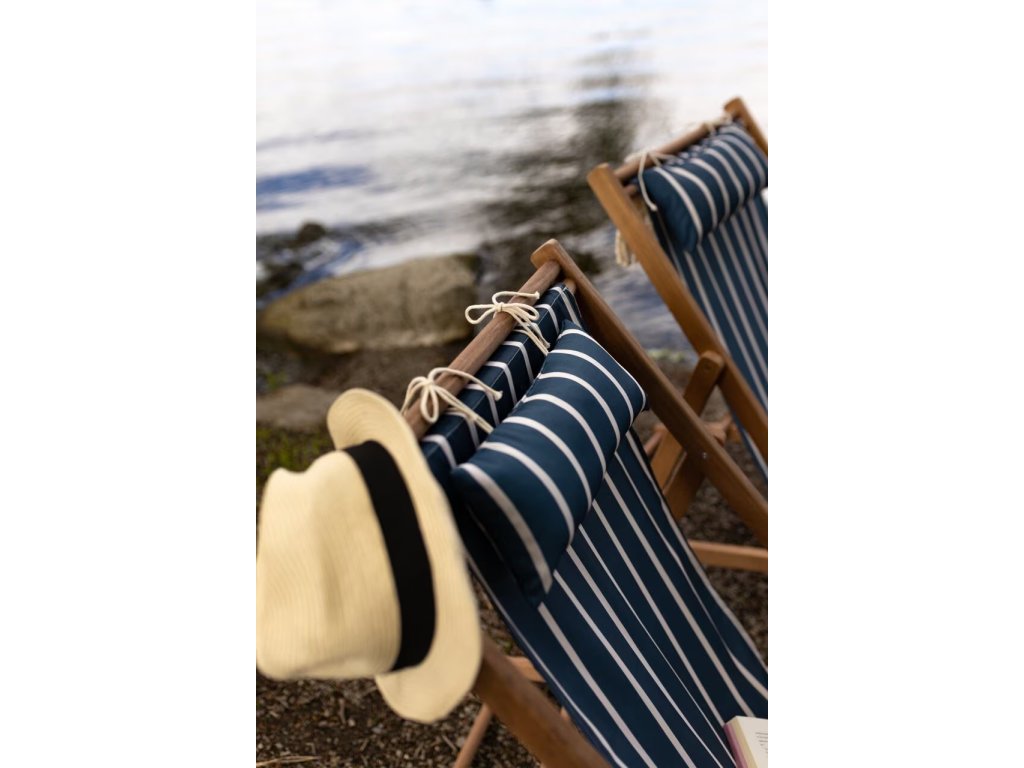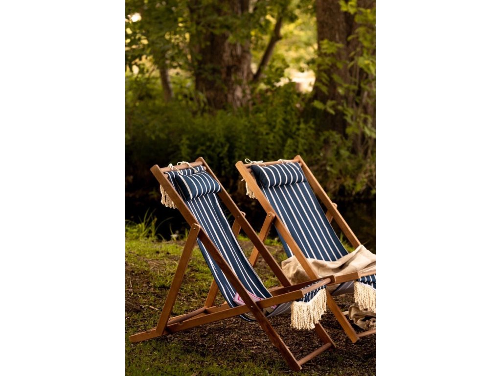 Klasické skládací dřevěné křeslo určené k odpočinku na zahradě, terase nebo pláži. Sedák a opěrák jsou z pevného pruhovaného materiálu, který se přizpůsobí tělu a nabízí pohodlné sezení. Dekorativní konce látky s třásněmi dodávají tradiční vzhled.