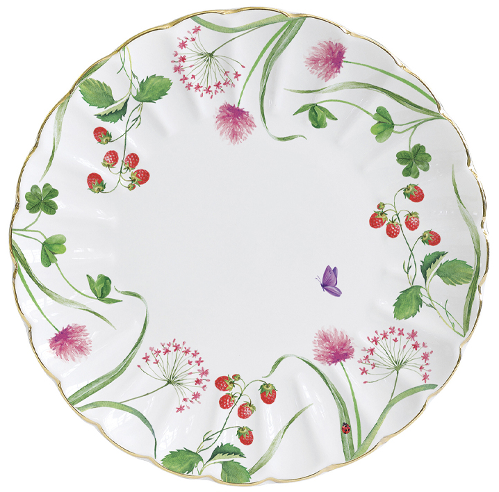 Design inspirovaný přírodou: Dezertní talíř En Plein Air okouzlí jemnými květinovými motivy, bylinkami a červenými jahodami, které evokují pohodu a klid zahrady.