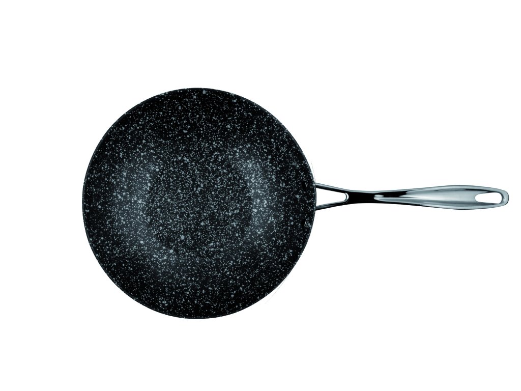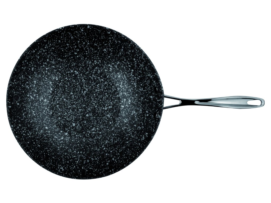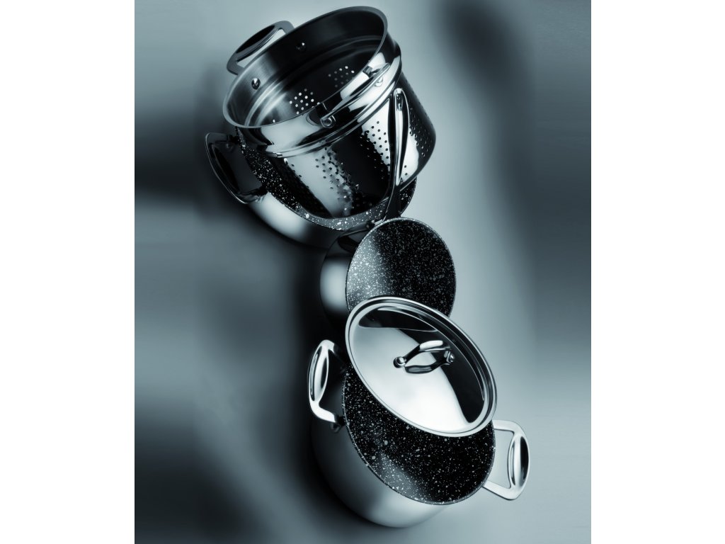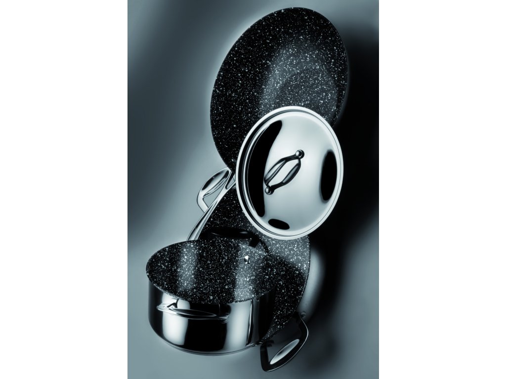 Materiály: nerezová ocel 18/10 (nejhygieničtější, nerezavějící a snadno čistitelný materiál); nepřilnavá vrstva Stone (odolná vůči kovovým nástrojům a vysokým teplotám).