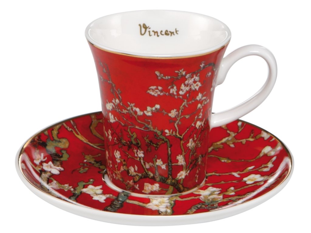 Krásný červený šálek na espresso s motivem japonské mandloně od jednoho z nejvýznamnějších umělců světa, Vincent Van Gogh.