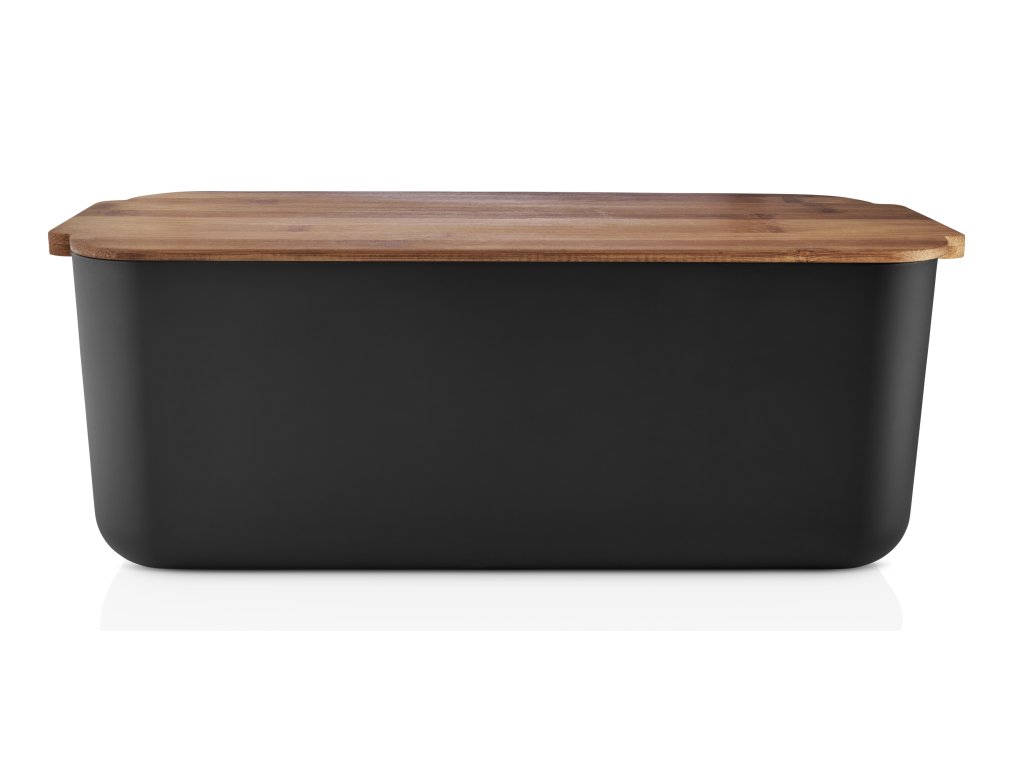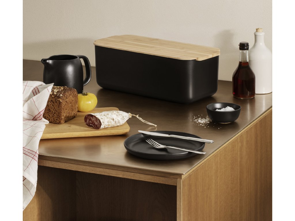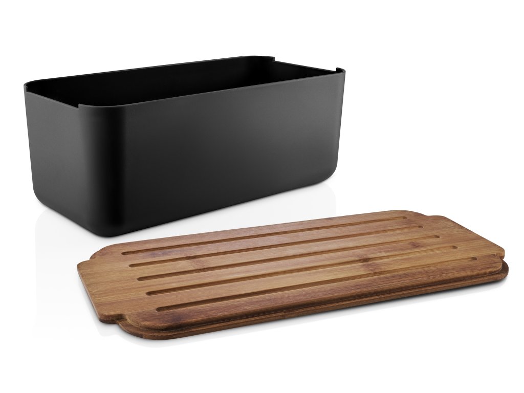 Naolejované víko nádoby z bambusu je dvojúčelové, slouží jako vestavěné odolné prkénko na krájení s praktickými drážkami pro zachycení drobků, když se na prkénku krájí bochník.