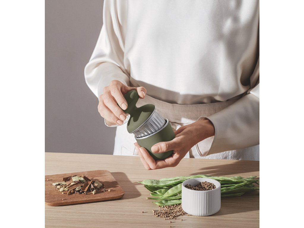 Drtí a drtí koření jednoduchým otáčením tam a zpět. Vybrané koření se shromažďuje v nádobě a je připraveno k použití ve vašem jídle.