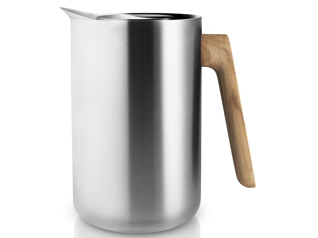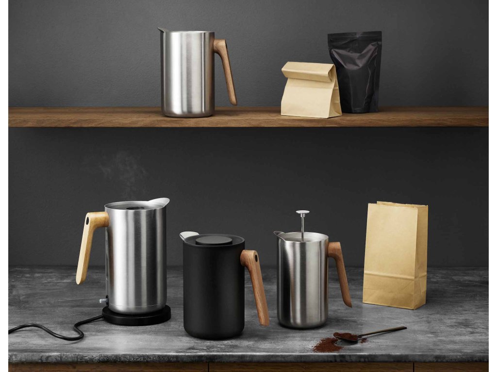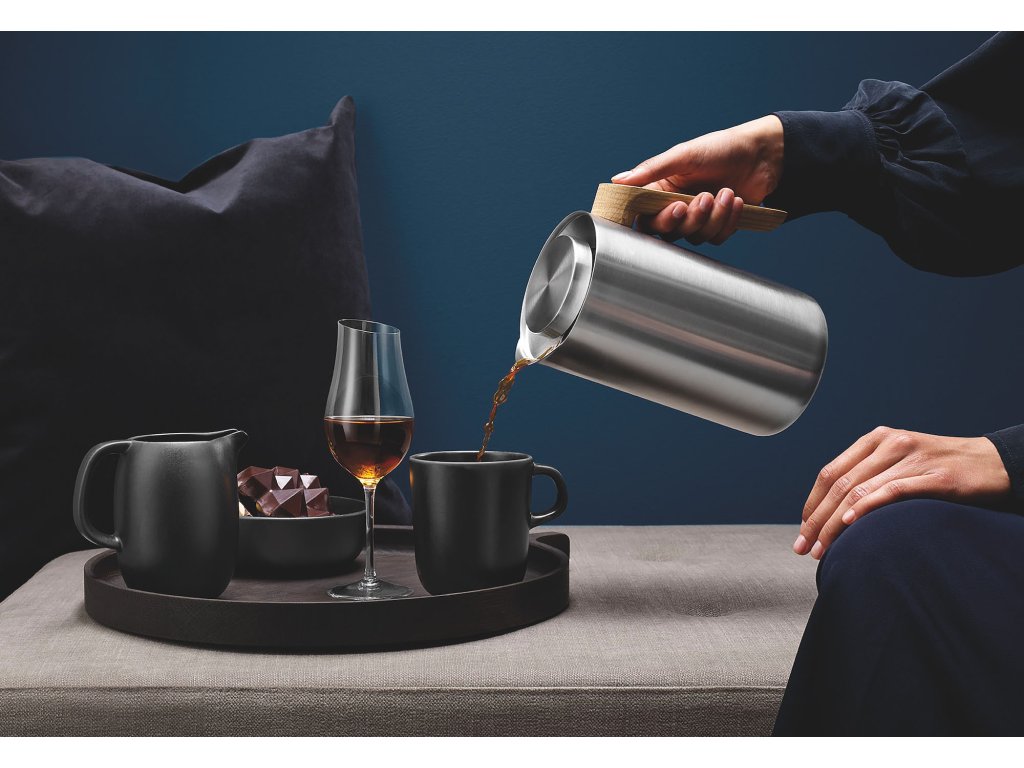 Vakuová konvice v černém plastu se svým designem i tvarem hodí k celé sérii Nordic Kitchen. Vakuová ocelová vložka zajišťuje, že vaše káva nebo čaj zůstanou horké po dlouhou dobu, a také znamená, že konvička je obzvláště robustní a odolná proti nárazům. Jedinečná dubová rukojeť vakuové konvice se zaoblenými hranami poskytuje bezpečné uchopení při servírování a nalévací okraj z nerezové oceli nekape.