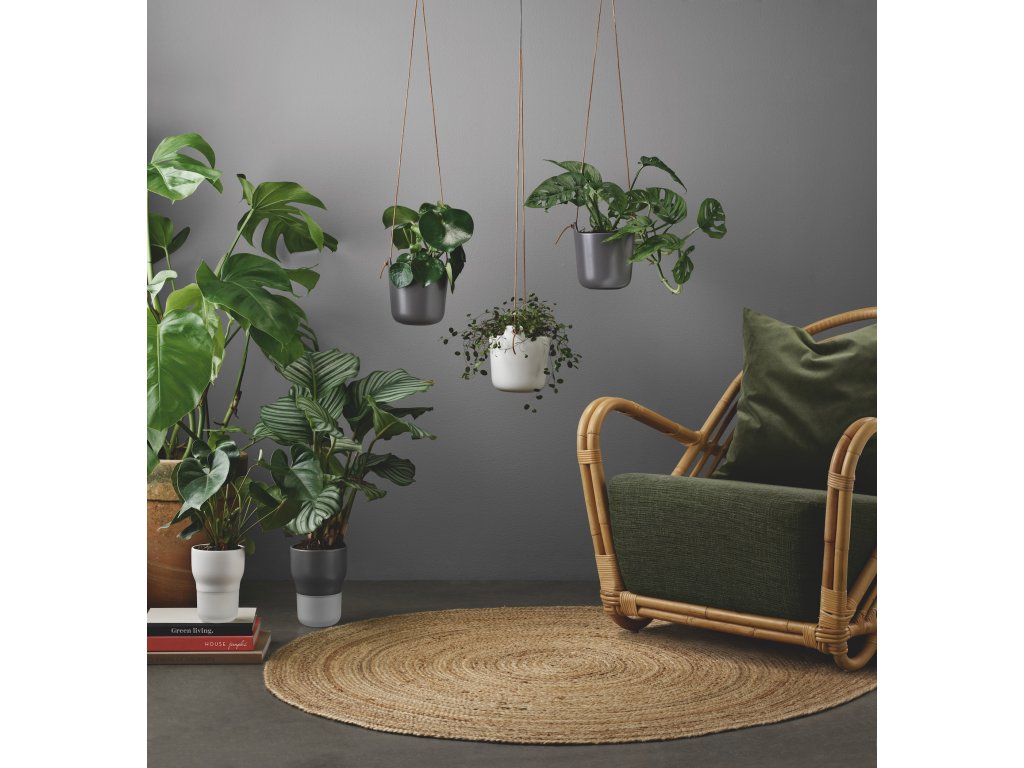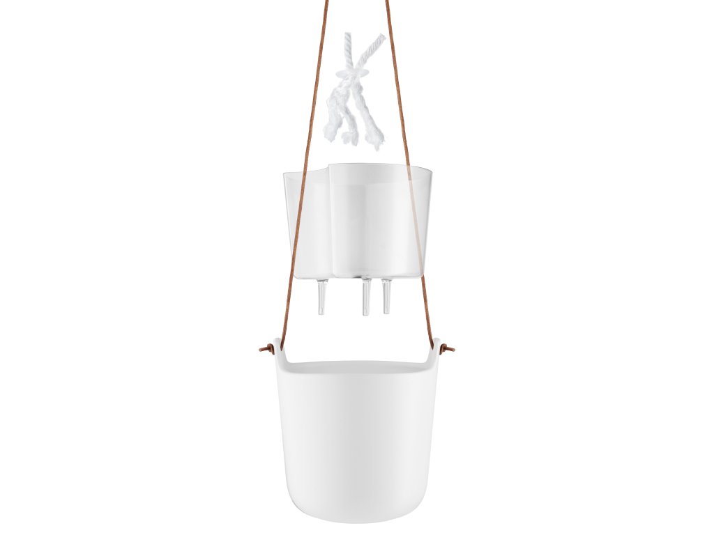 Samozavlažovací, dekorativní květináče z matné kameniny s koženou šňůrkou na zavěšení. Organický design se samozavlažovacím systémem, který poskytuje optimální podmínky pro pěstování bylinek a květin. Nylonové knoty na dně horního květináče umožňují rostlině čerpat vodu, kterou potřebuje, ze zásobníku vody ve spodním květináči. Plastová vložka na rostliny má zavlažovací kanál, který usnadňuje doplňování.