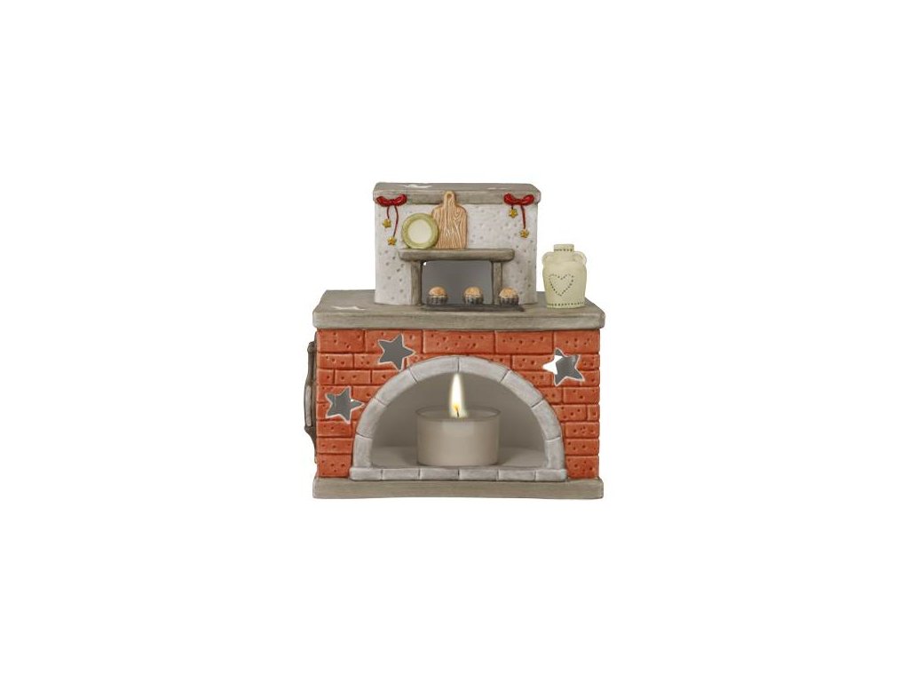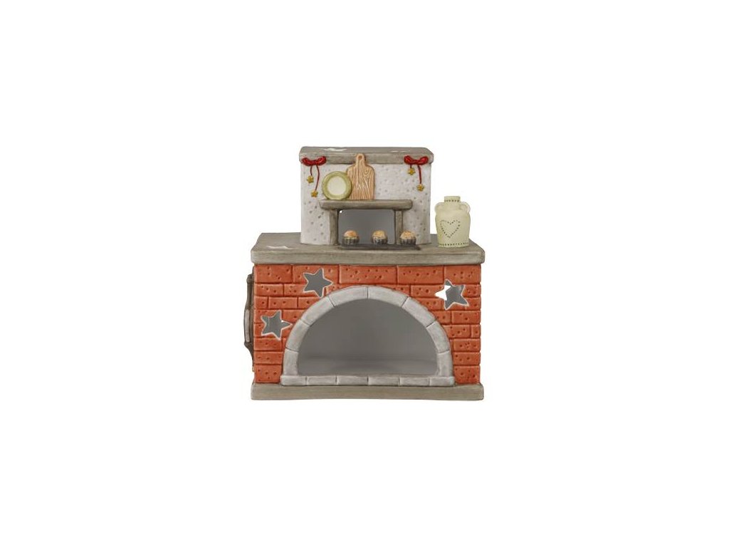 Motiv: Oven je symbolem útulnosti a tepla v zimním období, kdy kuchyně bývala nejteplejším místem v domě, a v tomto případě přímo evokuje vůni čerstvě upečeného dortu.