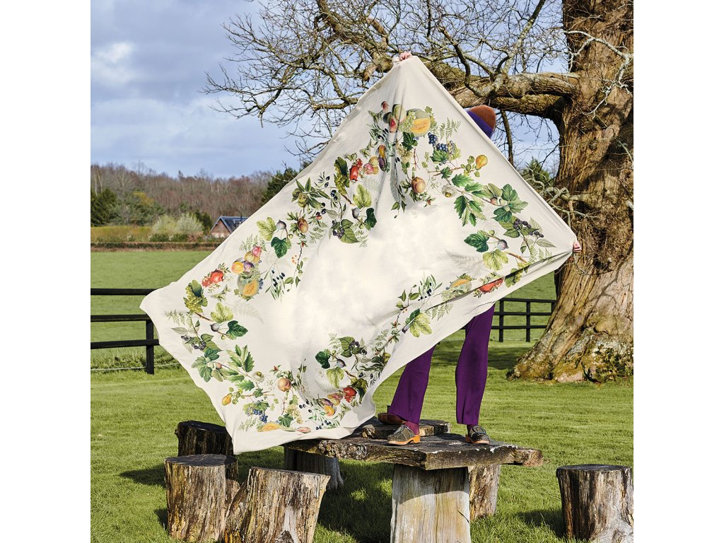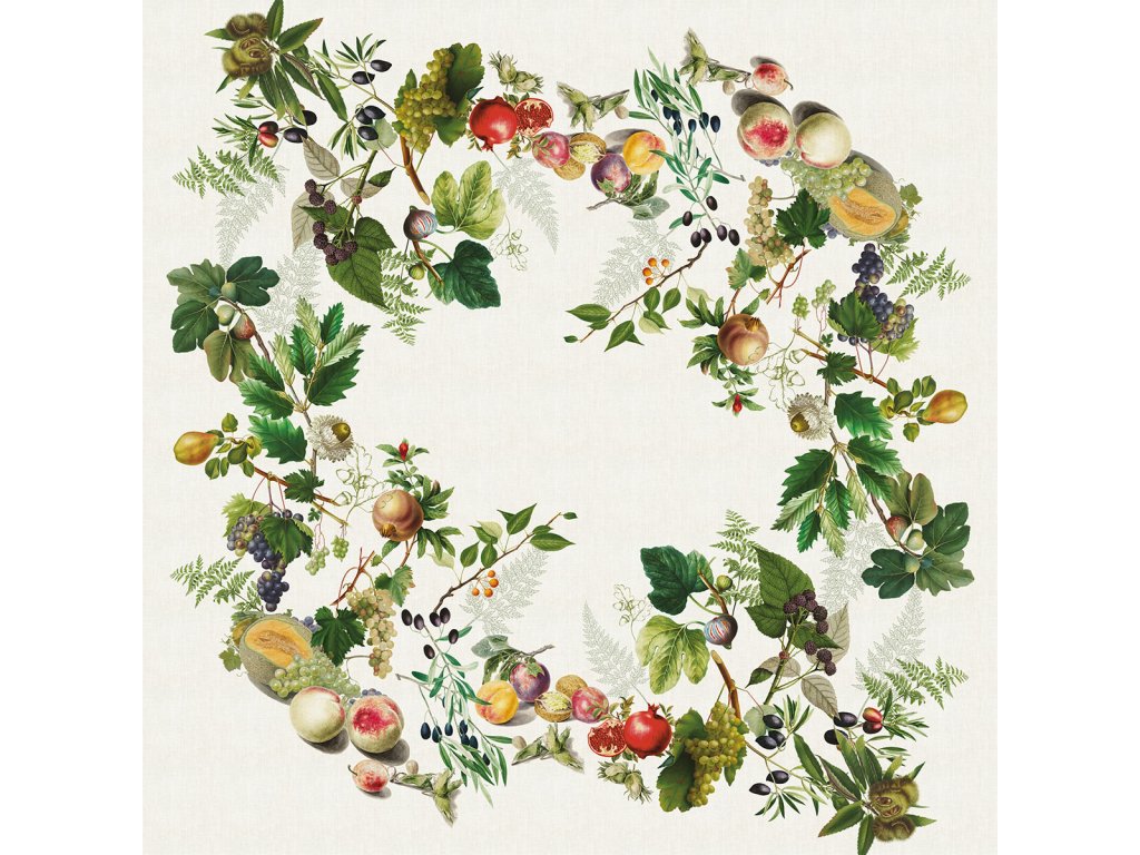 • Design: Bohatý motiv podzimních plodů a listí, který evokuje atmosféru sklizně a hojnosti. Detaily jako hrozny, meloun, broskve a další plody vytvářejí krásný a živý vzor.