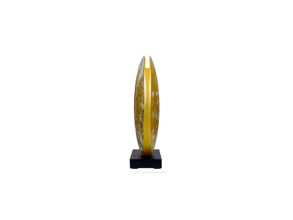 Nová dekorativní váza s diskem představuje současnou interpretaci mandloně ve zlaté barvě. Porcelánový kotouč se zdá být volně plovoucí na dřevěné podložce. Designový předmět, který prezentuje vyobrazený slavný obraz Van Gogha v důstojném vzhledu. Je to krásný poutač v každém stylovém prostředí a lze jej ozdobit květinovými aranžmá nebo bez nich.