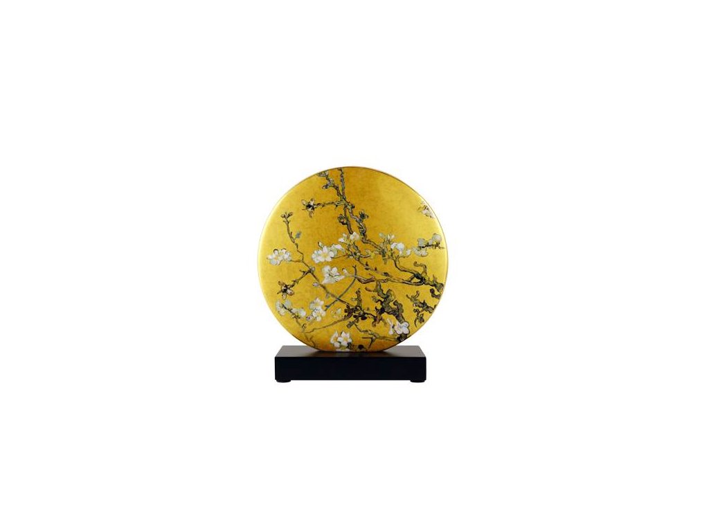 Nová dekorativní váza s diskem představuje současnou interpretaci mandloně ve zlaté barvě. Porcelánový kotouč se zdá být volně plovoucí na dřevěné podložce. Designový předmět, který prezentuje vyobrazený slavný obraz Van Gogha v důstojném vzhledu. Je to krásný poutač v každém stylovém prostředí a lze jej ozdobit květinovými aranžmá nebo bez nich.