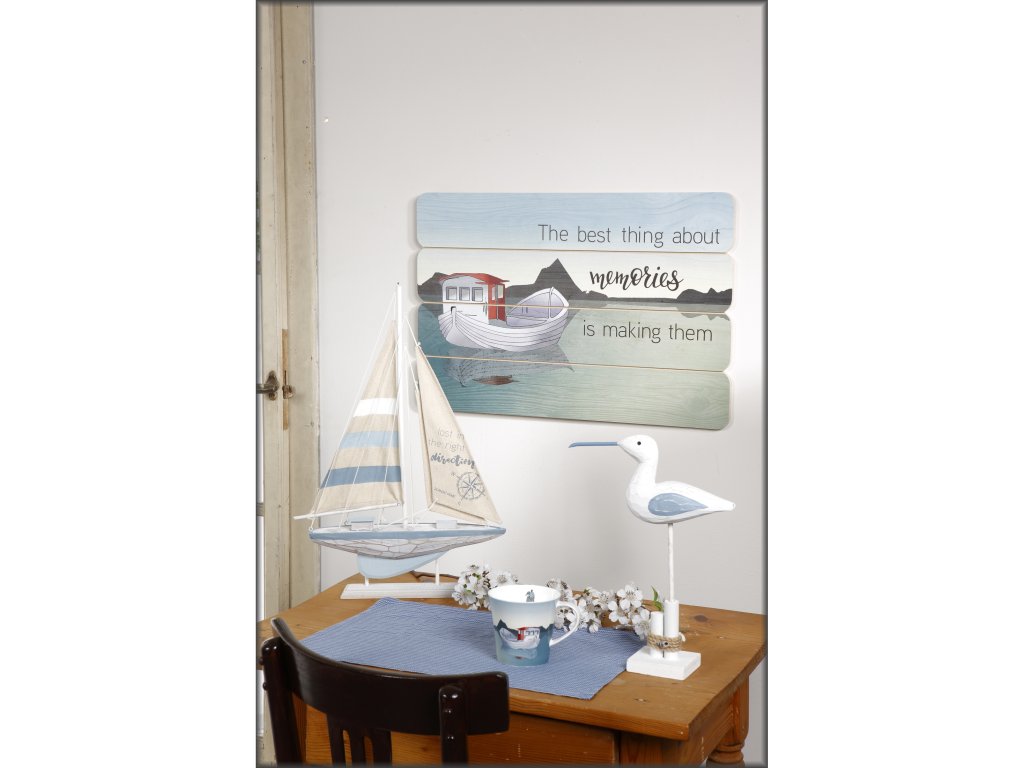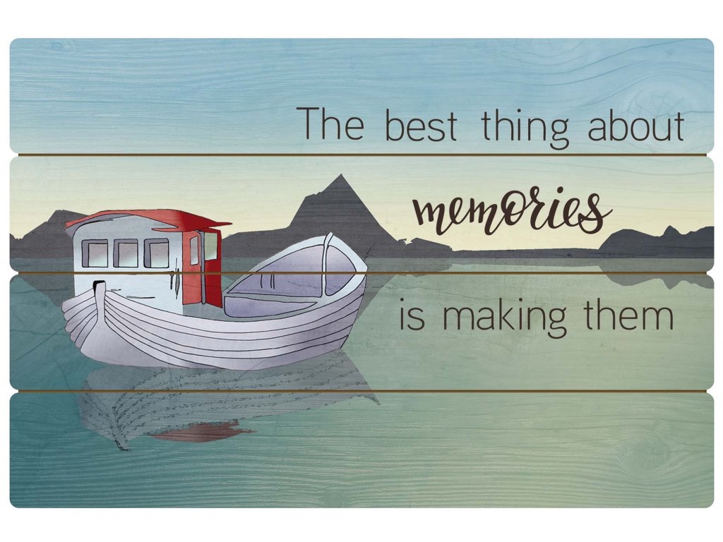 Obraz je navržen s velkou láskou k detailům, což se odráží v precizním provedení každé linie. Chladné barvy a jasné linie přinášejí do prostoru svěžest a styl, zatímco romantický motiv rybářské lodi evokuje vzpomínky na nezapomenutelné okamžiky u moře. Nápis “The best thing about memories is making them” dodává obrazu hlubší smysl a povzbuzuje k vytváření nových zážitků.