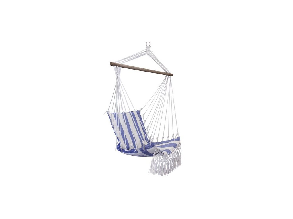 Krásné závěsné křeslo s klasickým pruhovaným sedákem, doplněné dekorativními třásněmi. Sedák je zavěšen mezi dřevěnou tyčí, čímž vzniká pohodlné místo pro relaxaci. Ideální pro zahradu, balkon nebo interiér – přináší klid a stylový vzhled.