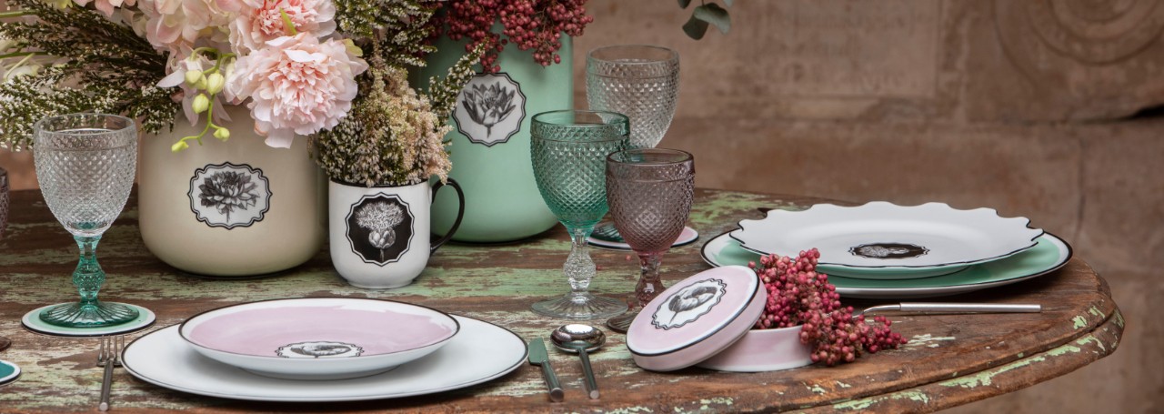 Kolekce porcelánu Herbariae od portugalské značky Vista Alegre je inspirována naturalismem a dekoračním nádobím, které zdobilo stoly na francouzském dvoře. Mísy, talíře, hrníčky i celé sady Herbariae od Vista Alegre mají jemné pastelové barvy, výrazné černé okraje a kresby rostlin. Porcelán s rostlinnými motivy si můžete pořídit v klasické černobílé, ale i pastelové variantě.