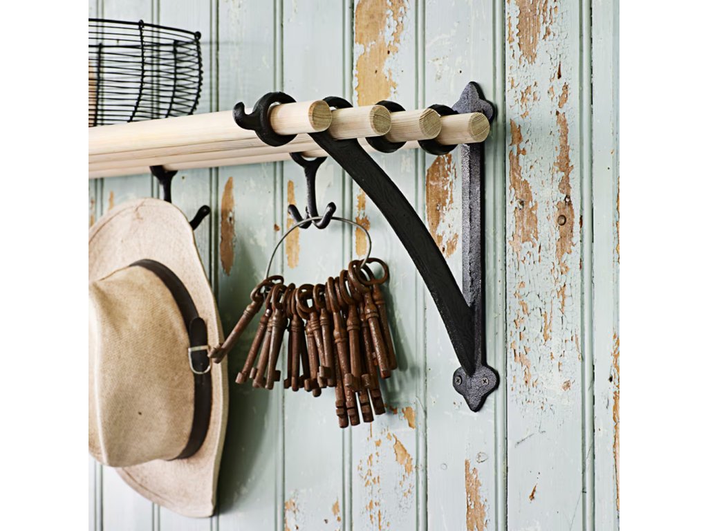 Proměňte jednoduchou tyč na stylový věšák pomocí pevného kovového držáku Evert Black, který snadno upevníte pod polici, ke stropu nebo na stěnu. Tento minimalistický doplněk umožňuje sestavit si vlastní uspořádání se závěsnými háčky, klíči, šály nebo dekoracemi.