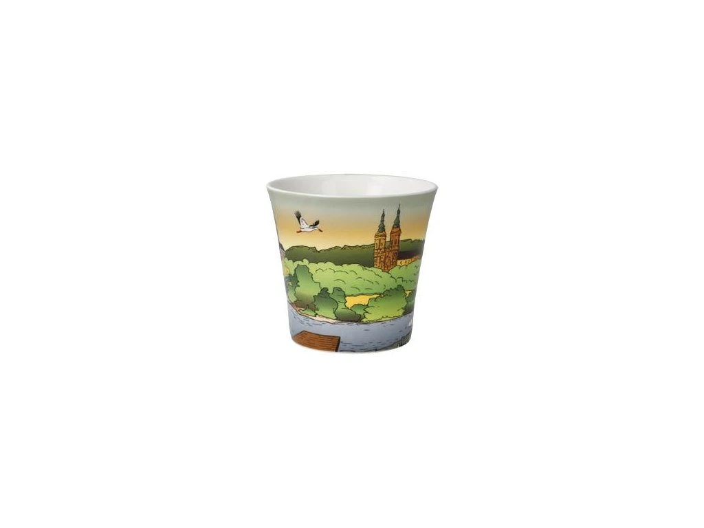 Tento elegantní hrnek Bad Staffelstein – Gottesgarten z jemného Fine Bone China (kostního porcelánu) je poctou jednomu z nejmalebnějších koutů Bavorska – oblasti zvané Gottesgarten am Obermain. Na hrníčku jsou zobrazeny ikonické dominanty této oblasti: basilika Vierzehnheiligen, klášter Banz a majestátní hora Staffelberg – všechna místa, která utvářejí duchovní i vizuální charakter tohoto kraje.