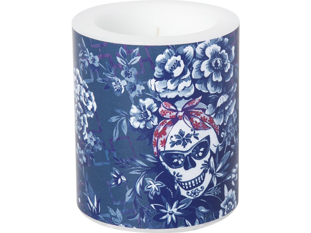Skleněný svícen IHR „CATRINA blue“ (CKM 922140) je dekorativní doplněk s podzimním motivem inspirovaným mexickým svátkem Día de los Muertos.