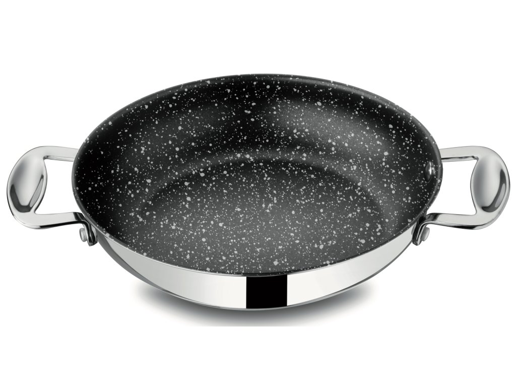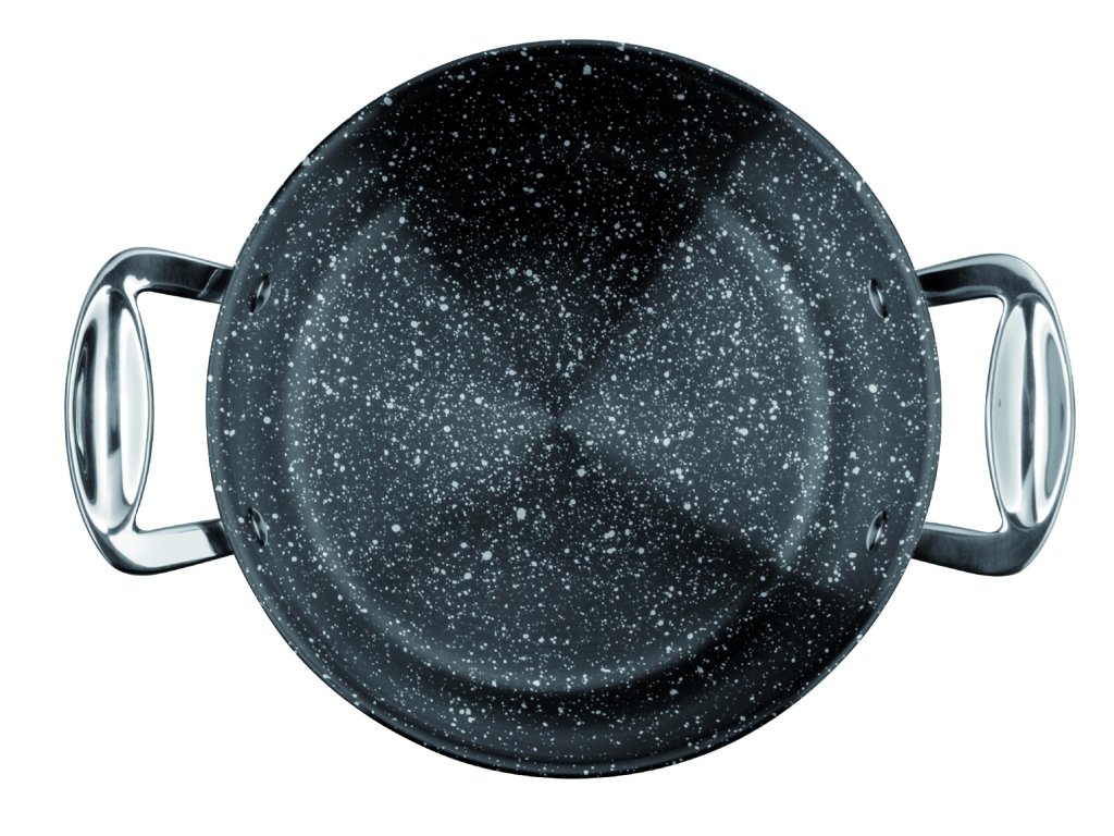 Materiály: nerezová ocel 18/10 (nejhygieničtější, nerezavějící a snadno čistitelný materiál); nepřilnavá vrstva Stone (odolná vůči kovovým nástrojům a vysokým teplotám).