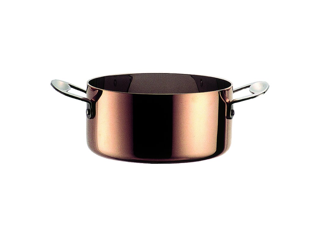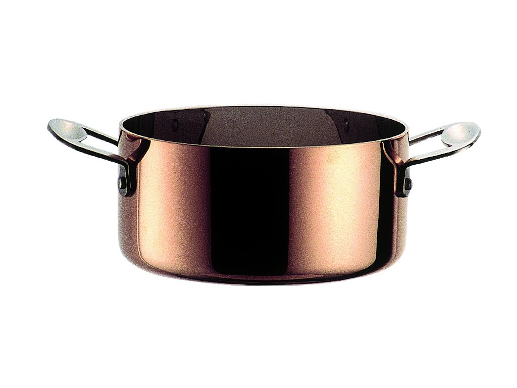 Měď, nerezová ocel. Bezešvá technologie spojení 3 hrnců (měď zvenčí zvyšuje tepelnou vodivost, hliník zapouzdřený uprostřed je médium pro vedení tepla po celé ploše hrnce a nerezová ocel 18/10 na vnitřní části pro snadné každodenní použití).Toscana Kastrol, 2 velikosti. Mepra. Itálie.