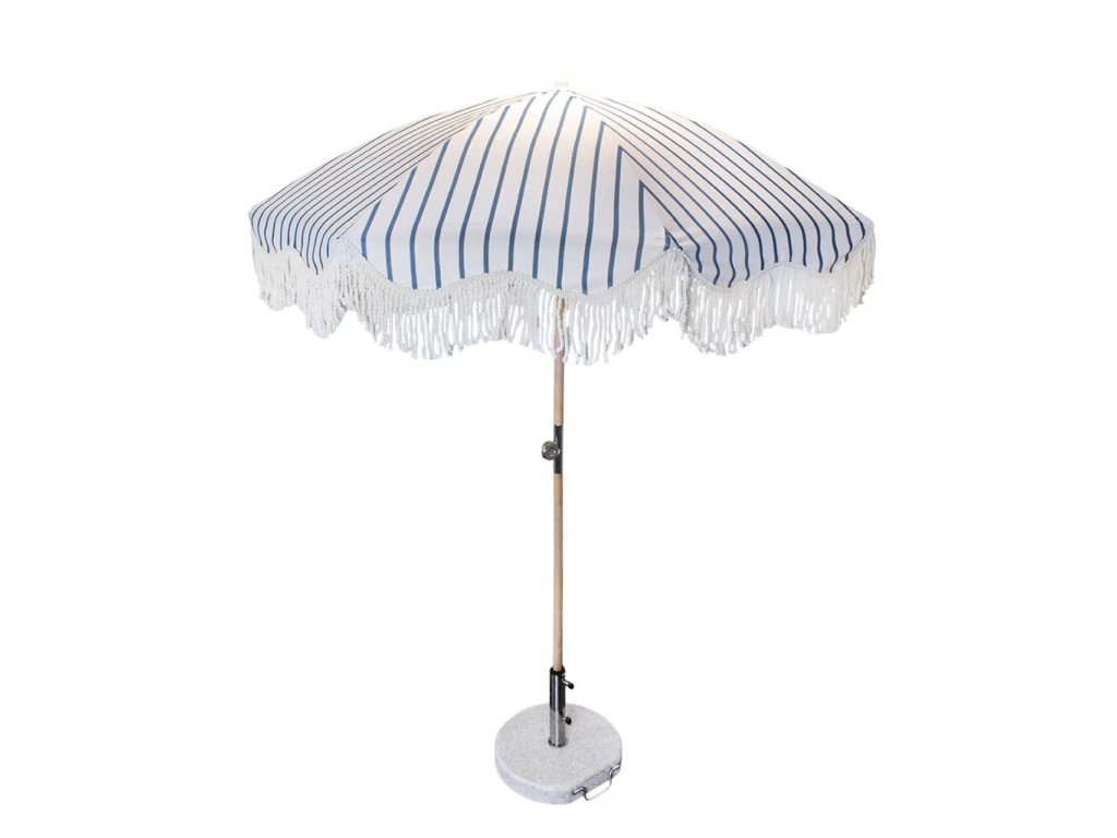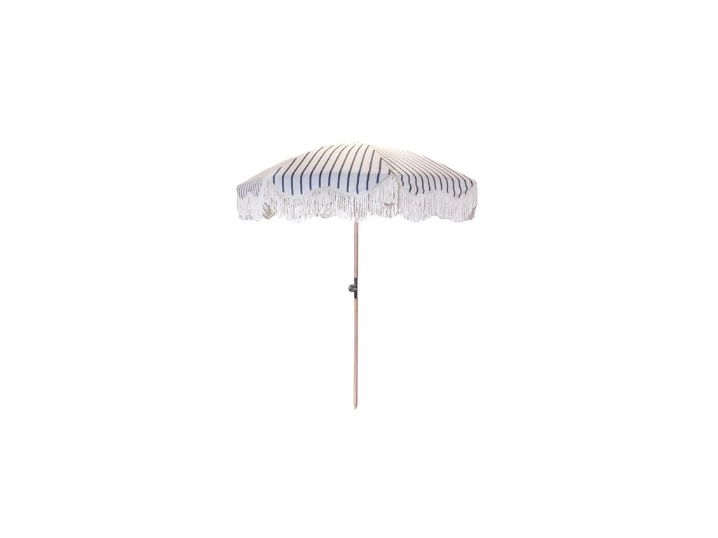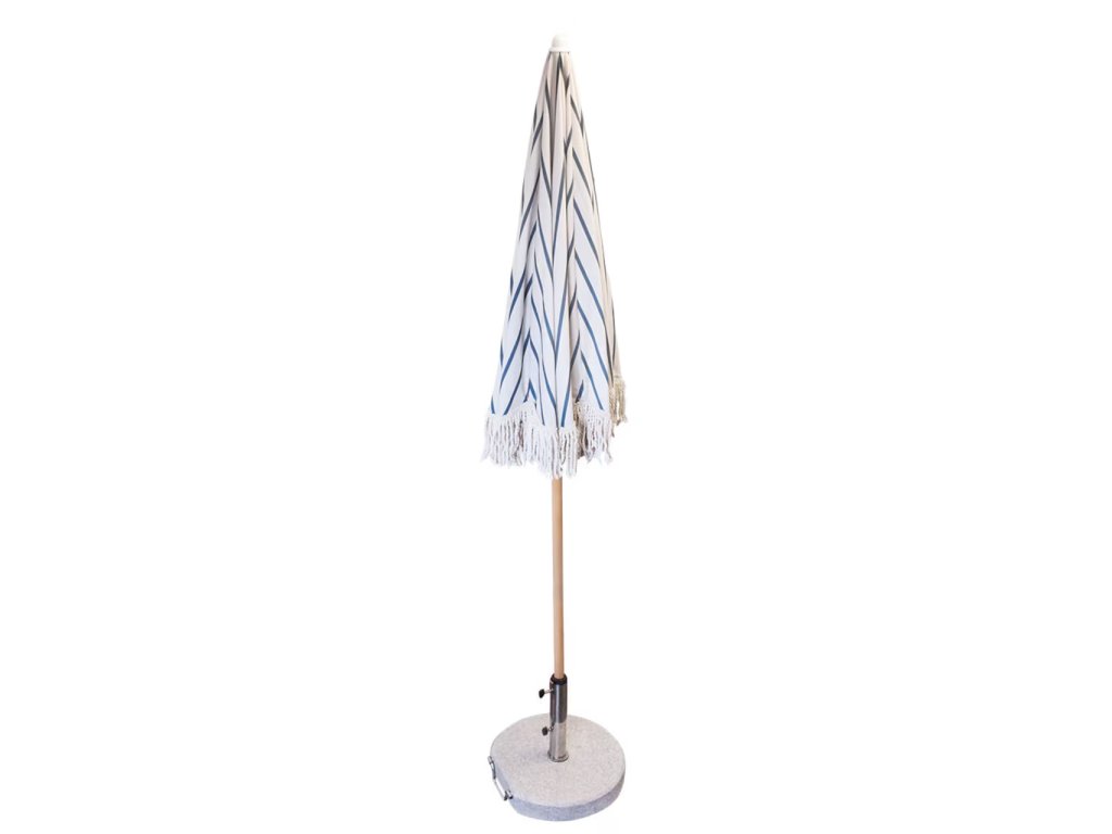 Klasický venkovní slunečník s přírodním dřevěným stojanem a odolnou látkou s pruhovaným vzorem. Snadno se ovládá klikou a lze jej naklopit pro optimální ochranu před sluncem. Ideální na terasu, zahradu i k vodě, kde vytvoří stylovou stínicí zónu.