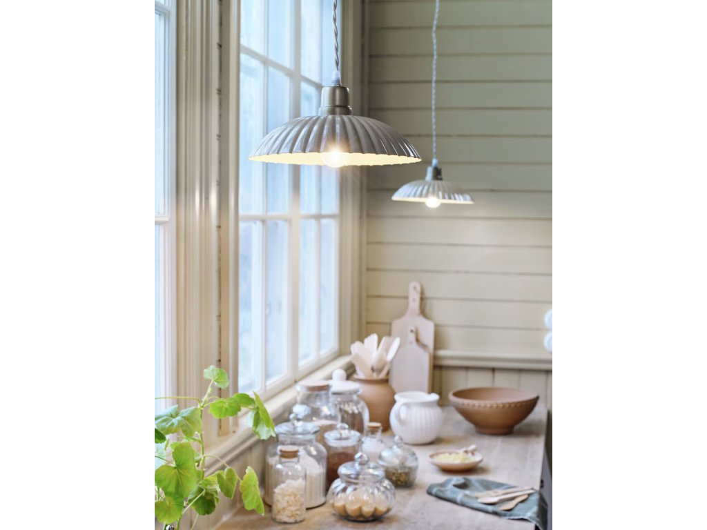 Vintage-inspirovaná závěsná lampa s vlnitým kovovým stínidlem, ručně malovaným pro autentický efekt. Ideální jako stylové osvětlení nad jídelní stůl, barový pult nebo do chodby. Dodává prostoru nádech nostalgie a hodí se do rustikálních i moderních interiérů.