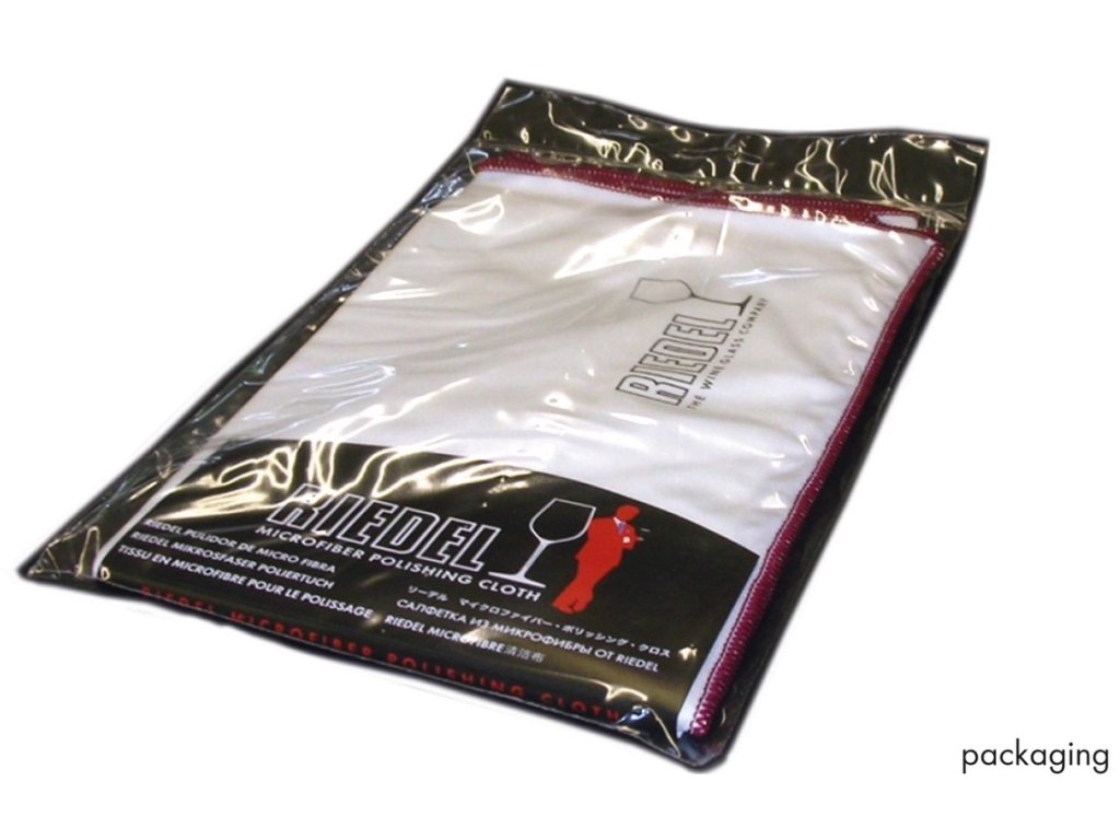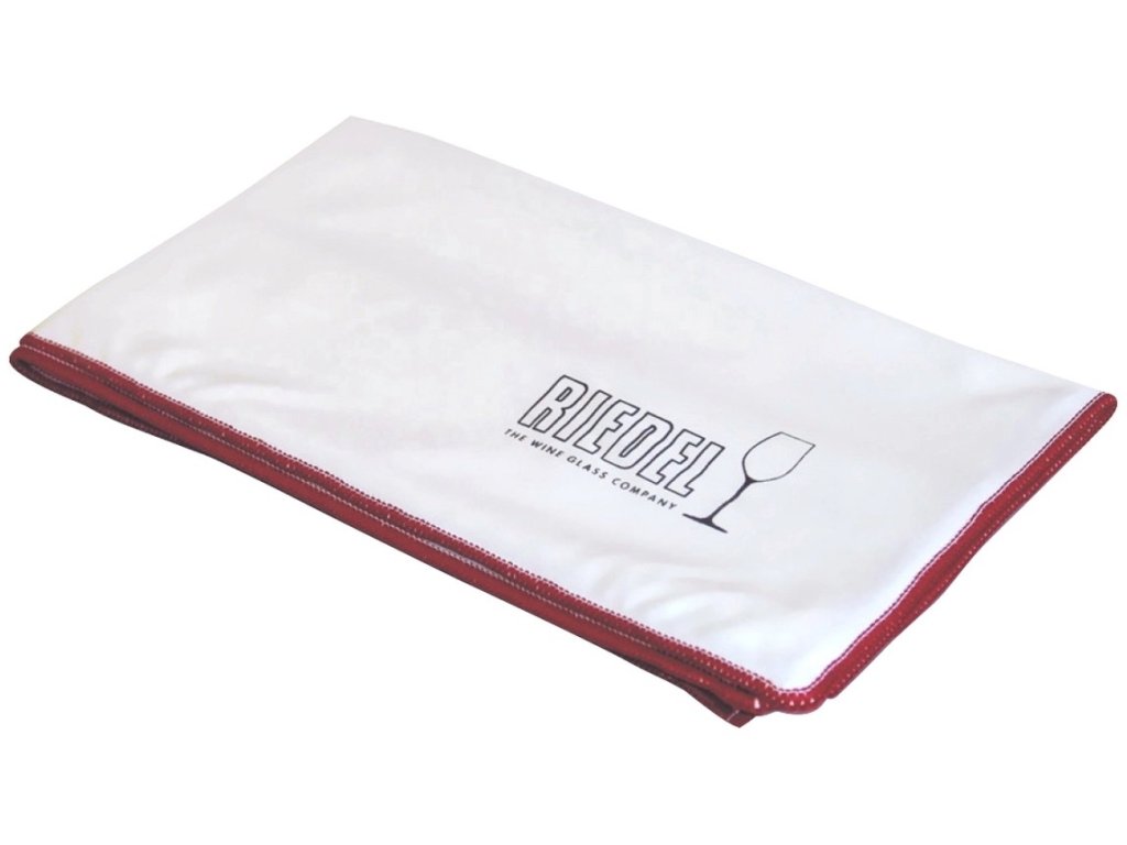 Velká leštící utěrka z mikrovlákna o rozměrech 50 x 64 cm / 19,69 x 25,2 palce je bílá, s červeným lemem a logem RIEDEL v pravém dolním rohu.