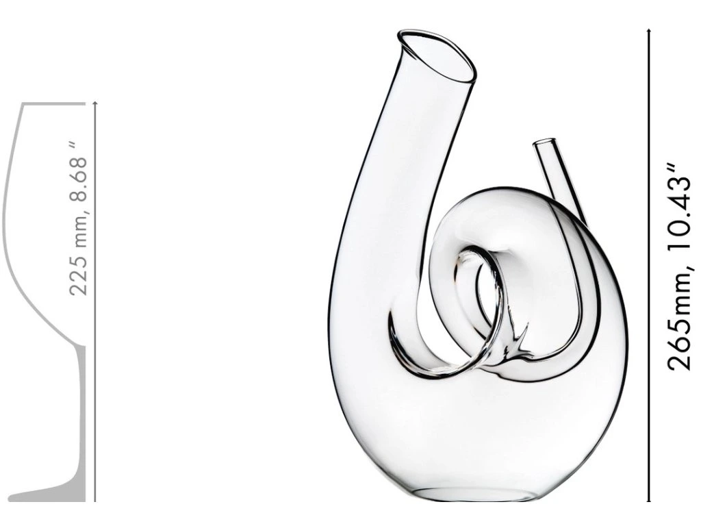 Cívky a zakřivení karafy Curly pomáhá nabíjet a provzdušňovat víno. Zákruty karafy tvoří měkkou a hravou spirálu s tenkým ocasem pro ozdobu a širší výlevkou pro snadné nalévání. Tento karafa byl ručně vyroben, což znamená, že každý kus je trochu jedinečný.