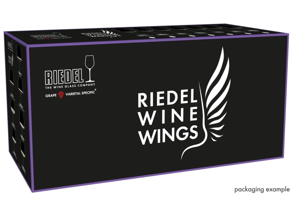 Pro vysvětlení konceptu RIEDEL Winewings: Zvolili jsme ploché a natažené dno s křídlovitým tvarem pro zvětšení plochy mezi vínem a vzduchem, což zvyšuje úrovně odpařování a rozvíjí větší intenzitu aroma. Při umístění hlavy ke sklenici je nos blíže a je vystaven širšímu povrchu vína. To však samo o sobě nedodá úplně optimální aroma každé odrůdy hroznů, a tak pro zachycení jemných vrstevnatých vůní bylo nutné zakřivit skleněné stěny a správně zkalibrovat otvor každé sklenice s ideálním průměrem okraje.
