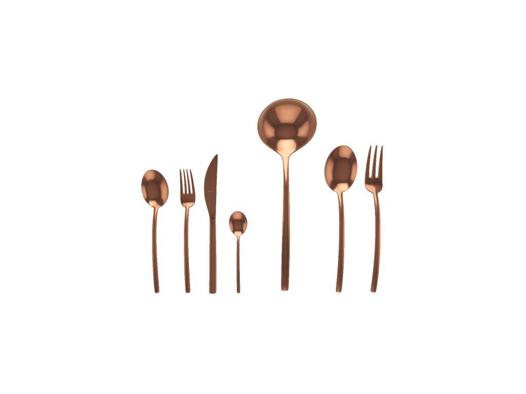 Všechny příbory jsou vyrobeny s PVD bronzovou úpravou (Due Bronzo), která zajišťuje vysokou odolnost proti opotřebení, poškrábání a zachovává lesklý bronzový odstín. Elegantní design s ergonomickým tvarem a vyváženými proporcemi zaručuje pohodlné používání a reprezentativní vzhled při stolování.