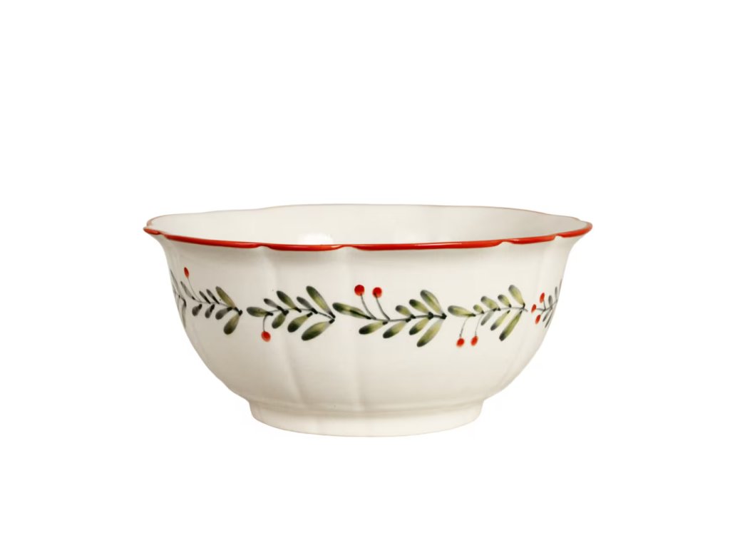 Připravte svůj stůl na slavnostní i každodenní chvíle s velkou keramickou mísou Esther zdobenou ručně malovaným motivem listů a brusinek. Každý kousek má jedinečný vzhled díky jemným rozdílům v malbě – dodá vašemu stolování osobitý šarm.