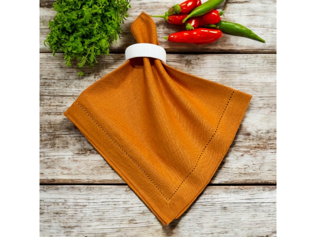 #SalsaVerde #Barcelona #středněOranžovýUbrousek #OzdobnáAžura #LuxusníStolování #KvalitníMateriály #Bavlna #Len #ModerníDesign #ElegantníStůl #DekoraceNaStůl