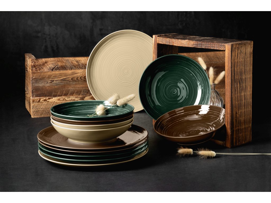 Tento mělký talíř z kolekce TERRA od značky Seltmann Weiden v odstínu „erdbraun“ (zemitě hnědá) přináší do vašeho stolování přírodní eleganci. Jemné spirálovité reliéfy na povrchu talíře dodávají jedinečný vzhled a příjemnou haptiku, která zaujme na první dotek. Každý kus je originál díky drobným nepravidelnostem ve struktuře glazury, což podtrhuje ruční charakter výroby.