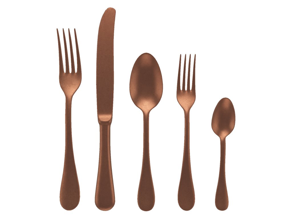 Nerezová ocel 18/10 s hloubkovou PVD úpravou v bronzové barvě s Vintage patinou. Uměle stařené příbory.