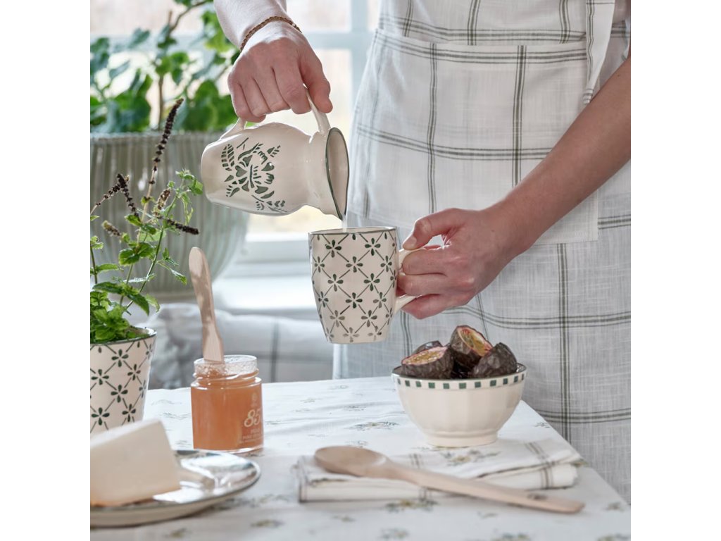 Keramický malý džbán z kolekce Marion s ručně malovaným klasickým vzorem a jemně zdobeným okrajem. V rustikálním stylu, inspirovaném venkovskou elegancí. Hodí se pro podávání mléka, smetany, omáček nebo jako malá váza.