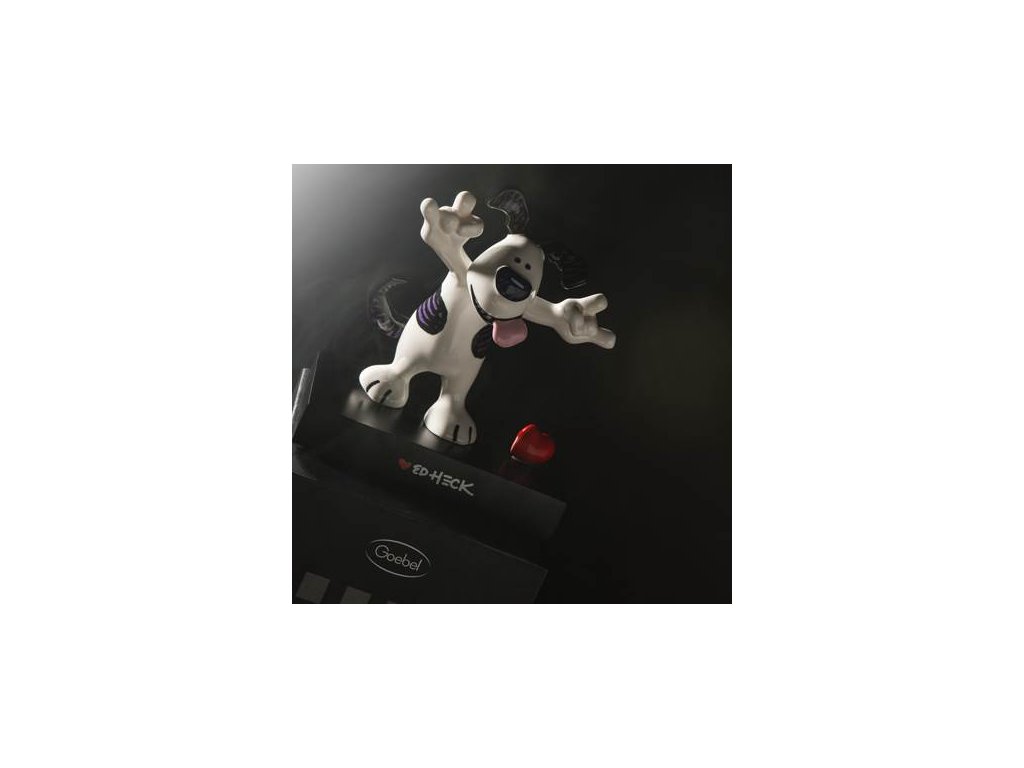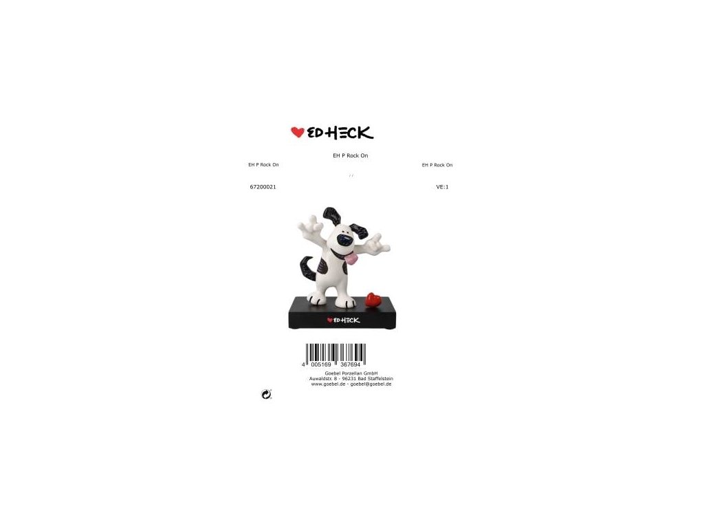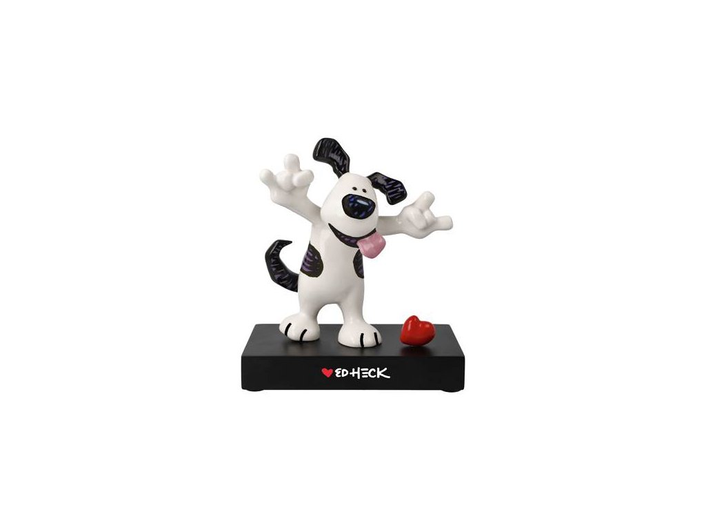 Socha Rock On od Ed Hecka představuje jeho charakteristického bílého psa s velkými černými skvrnami, dlouhými ušima a vděčným, někdy trochu zmateným pohledem. Tento roztomilý pejsek s úsměvem na tváři zaručeně rozzáří váš den a přinese do vašeho prostoru kus radosti a hravosti. Vyrobená z kvalitního porcelánu, umístěná na elegantní základně z fiberboardu (MDF), se tato figurka stane nejen skvělým doplňkem, ale i cenným sběratelským kouskem.