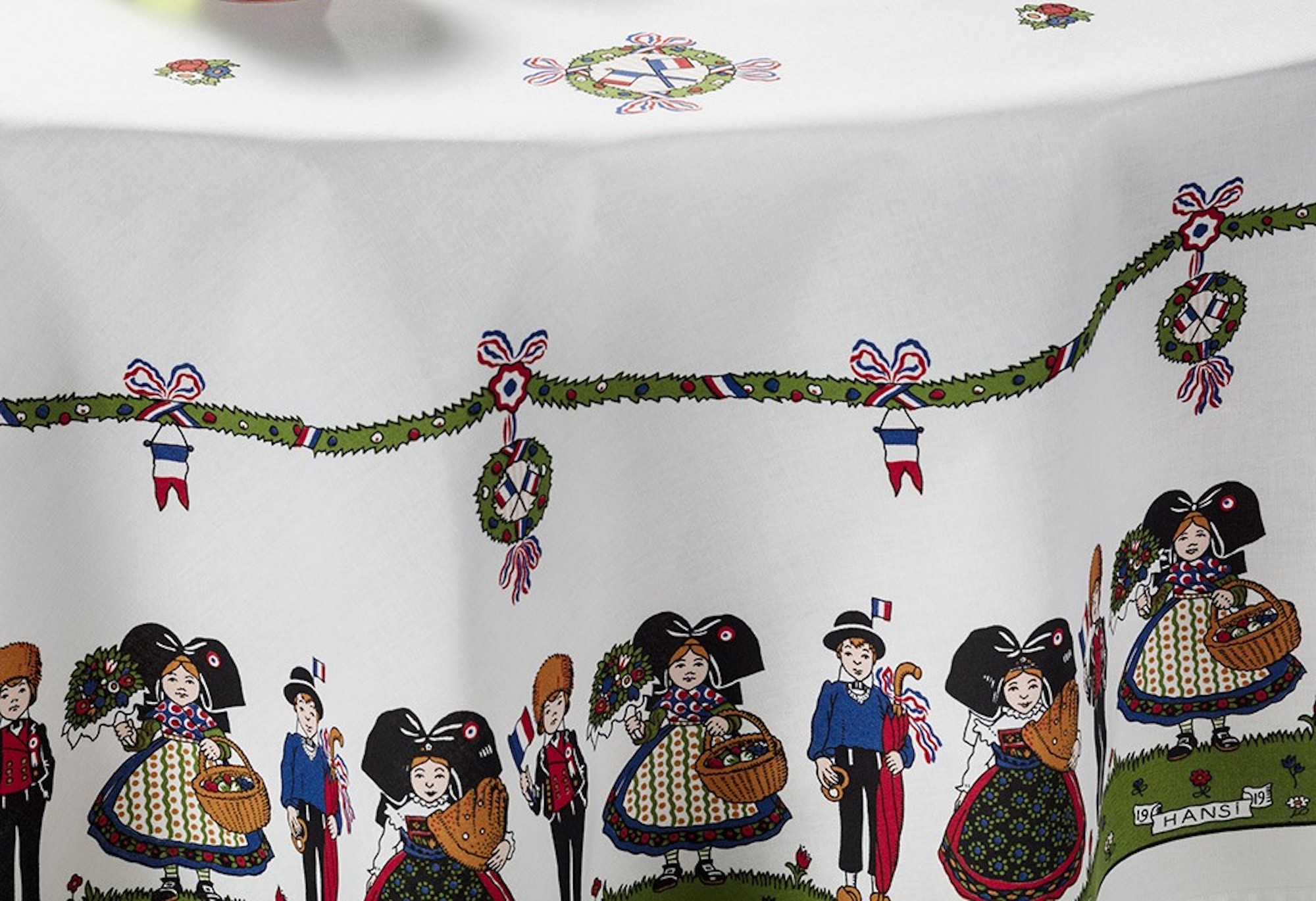 Naši umělci, vyškoleni na Beaux-Arts, se inspirují tradičními životními scénami z naší krásné alsaské oblasti, aby odhalili jedinečné alsaské ubrusy. Ubrus Hansi, vyrobený výhradně z bavlny v našich dílnách v Ribeauvillé, je tištěn na plochém rámu pod bedlivým dohledem našich výjimečných řemeslníků.
