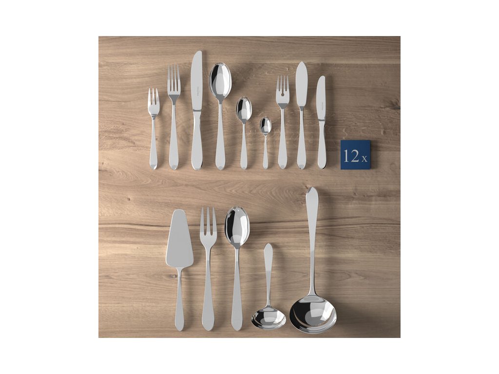 Sada obsahuje: 12x jídelní vidličku, 12x jídelní nůž, 12x jídelní lžíci, 12x lžičku na kávu, 12x vidličku na dort, 12x lžičku na espresso, 12x nůž, 12x vidličku na ryby, 12x nůž na ryby a 1x lopatku na dort
